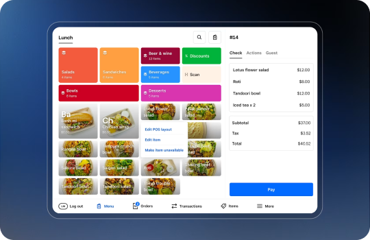 - Restaurant tools for counter service, full service, online ordering, and kitchen operations
